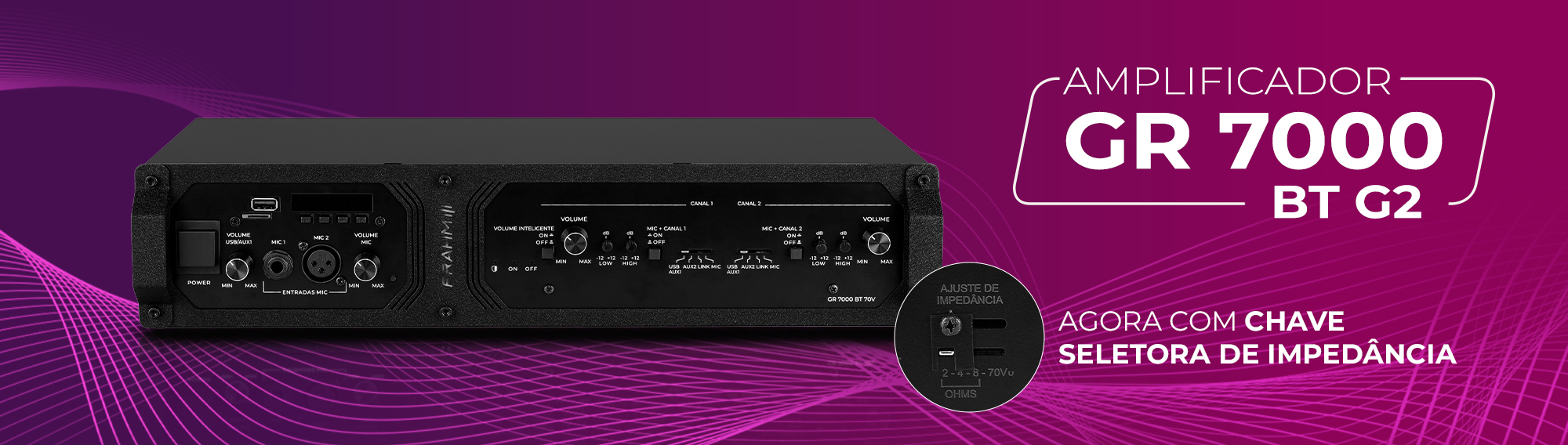 Eleve o padrão de áudio do seu ambiente com o AMPLIFICADOR GR 7000 BT G2 - FRAHM. Projetado para instalações profissionais em grandes espaços, esse equipamento entrega 1000W RMS reais de potência e uma performance estável, graças à exclusiva chave seletora de impedância (70V, 2/4/8 Ohms). Seja em supermercados, aeroportos, shoppings, igrejas ou auditórios, o GR7000 BT G2 oferece flexibilidade e qualidade sonora incomparáveis, adaptando-se perfeitamente a qualquer projeto de sonorização.